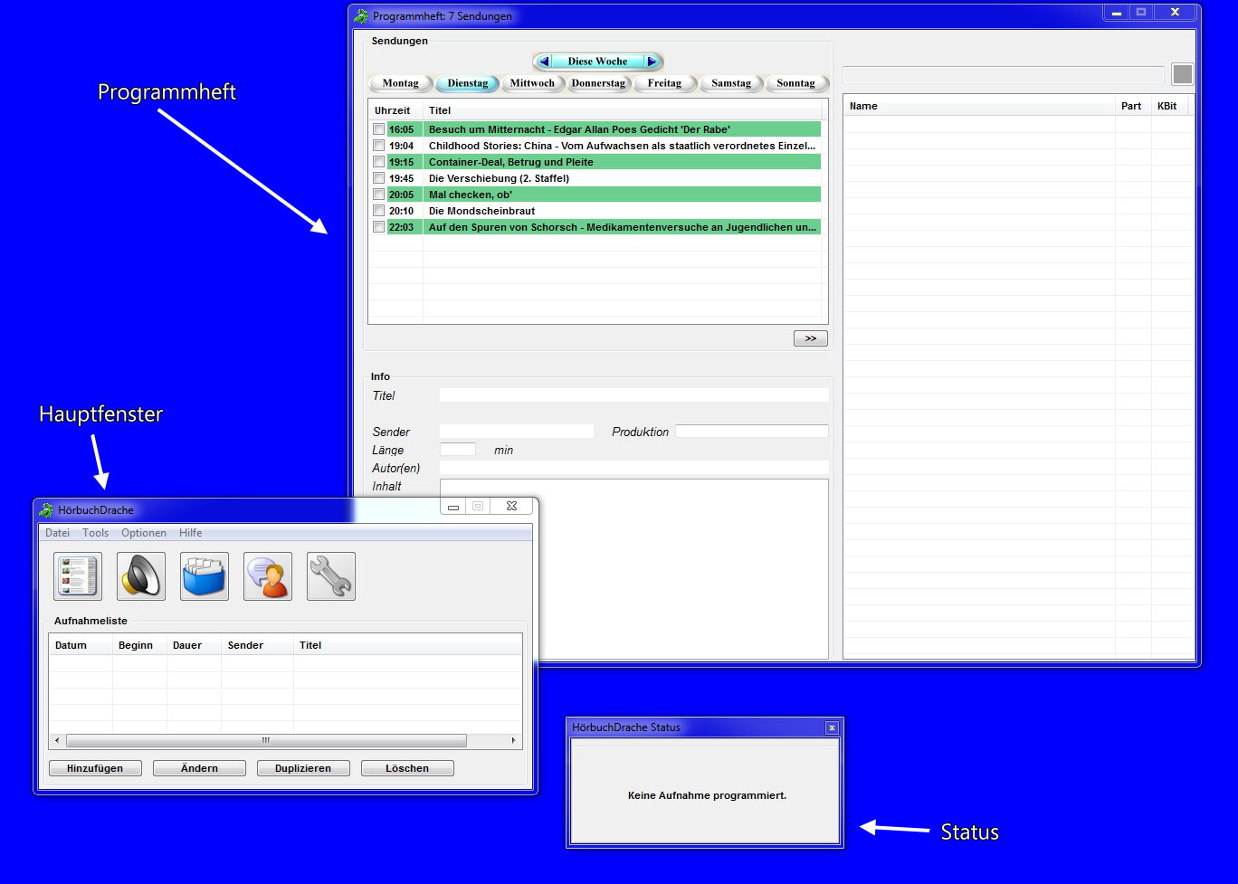 in Form einer windows GUI Anwendung, worüber die Kontrolle hauptsächlich vorgenommen wird. Hier wird der Programmführer angezeigt, die kommenden Aufnahmen werden festgelegt (ähnlich eines elektronischen Programmführers für das Fernsehprogramm). Bestehende Aufnahmen können durchsucht, die Kontrolle der zweiten Software Komponente vorgenommen werden und vieles mehr.